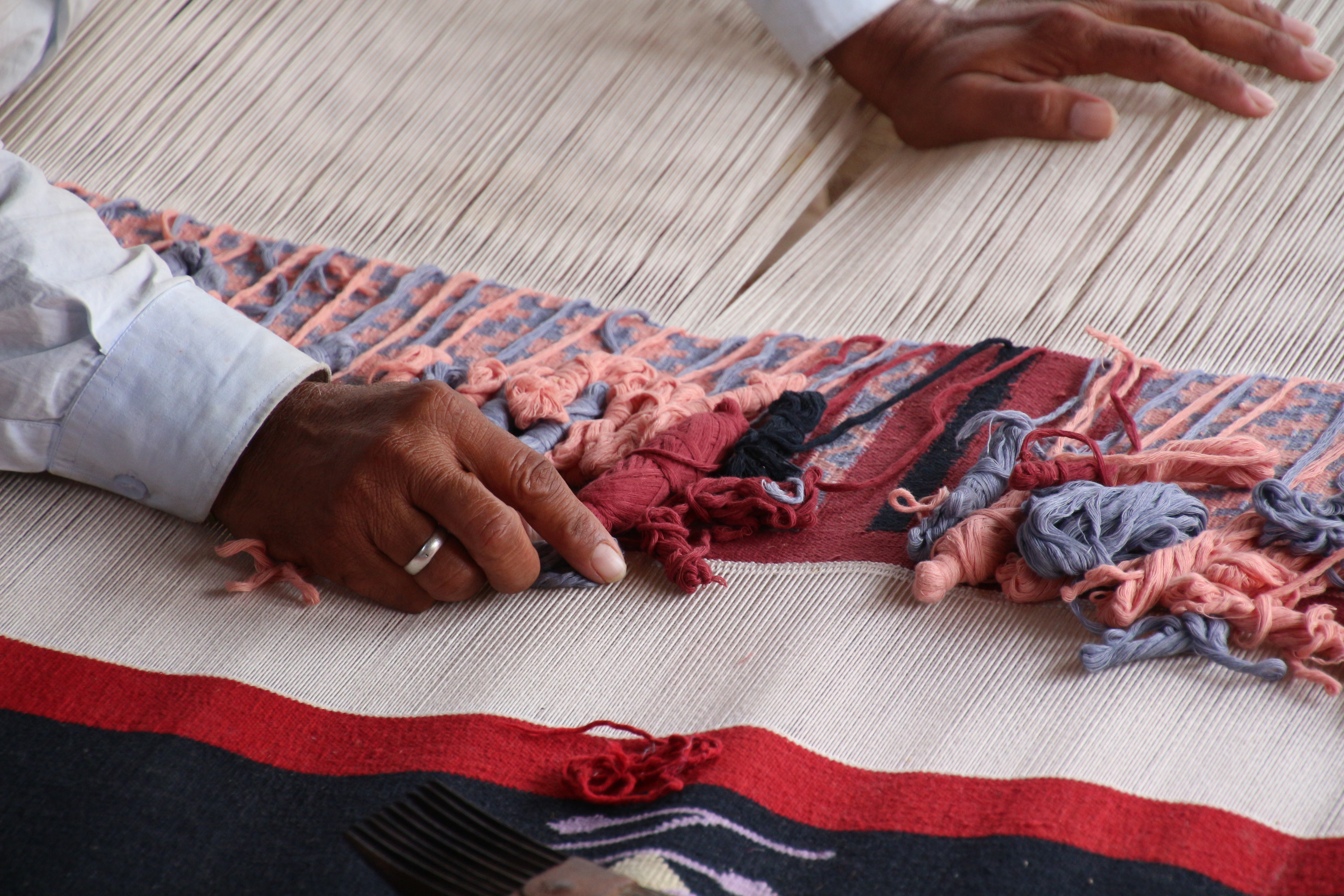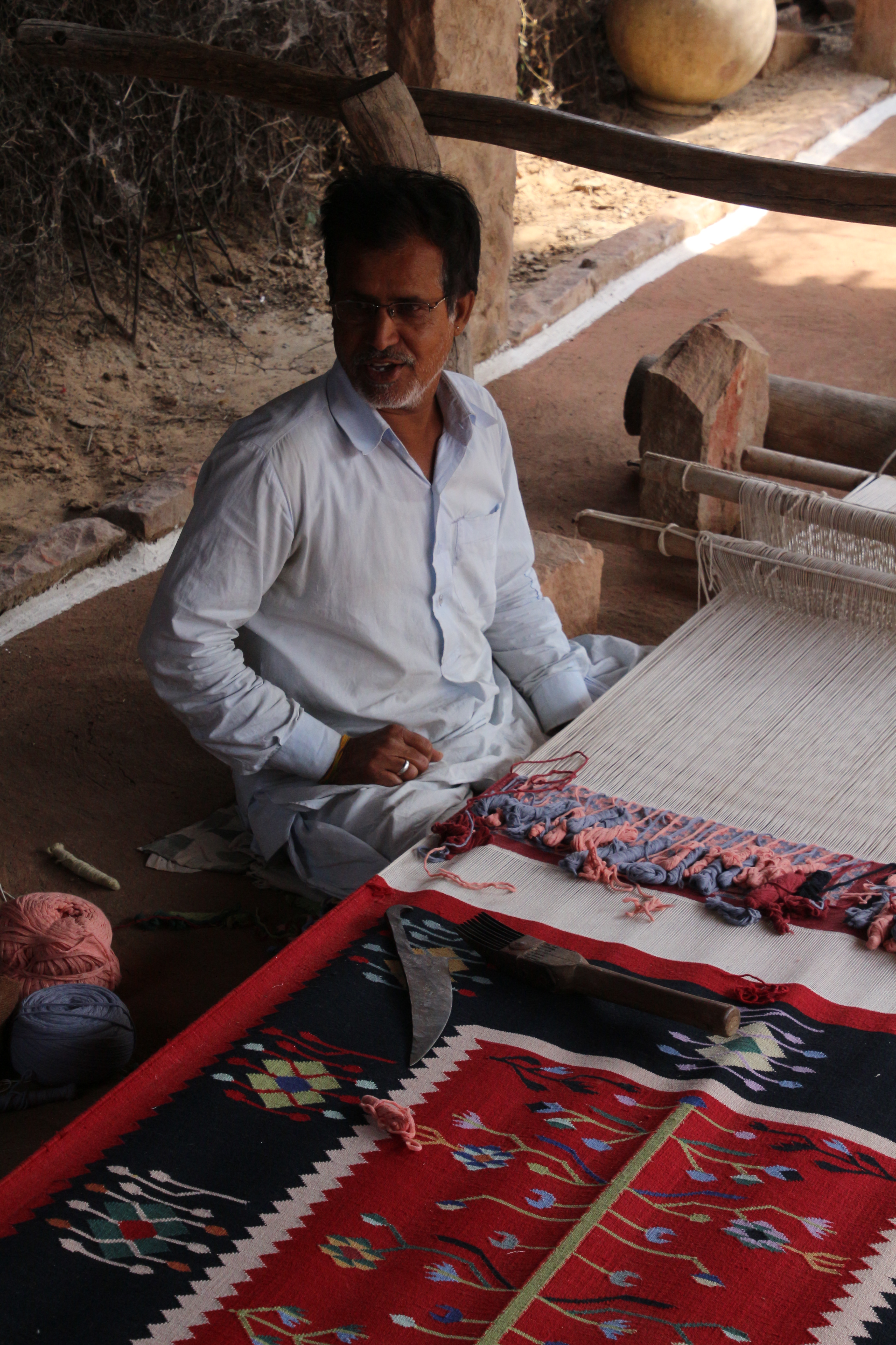 A clean, orderly man sat beneath a canopy and knotted a rug while listening to the radio. His impeccable English and good quality glasses hinted that he must not really spend his days tying rugs, but we tried our hardest to push that out of our minds. We’re pretty sure the man he introduced as his son holding his granddaughter was just a worker. I mean, they had an outhouse with an English toilet in it on the other side of their field… but that’s OK… You just hope that the men and women who do tie those rugs daily get their cut of the rugs he sells as an “authentic Rajasthani weaver.” Because no matter what system they set up, these rugs were being woven by hand by real people. No “Made in India” sticker necessary. Why am I over explaining this? Because I caved